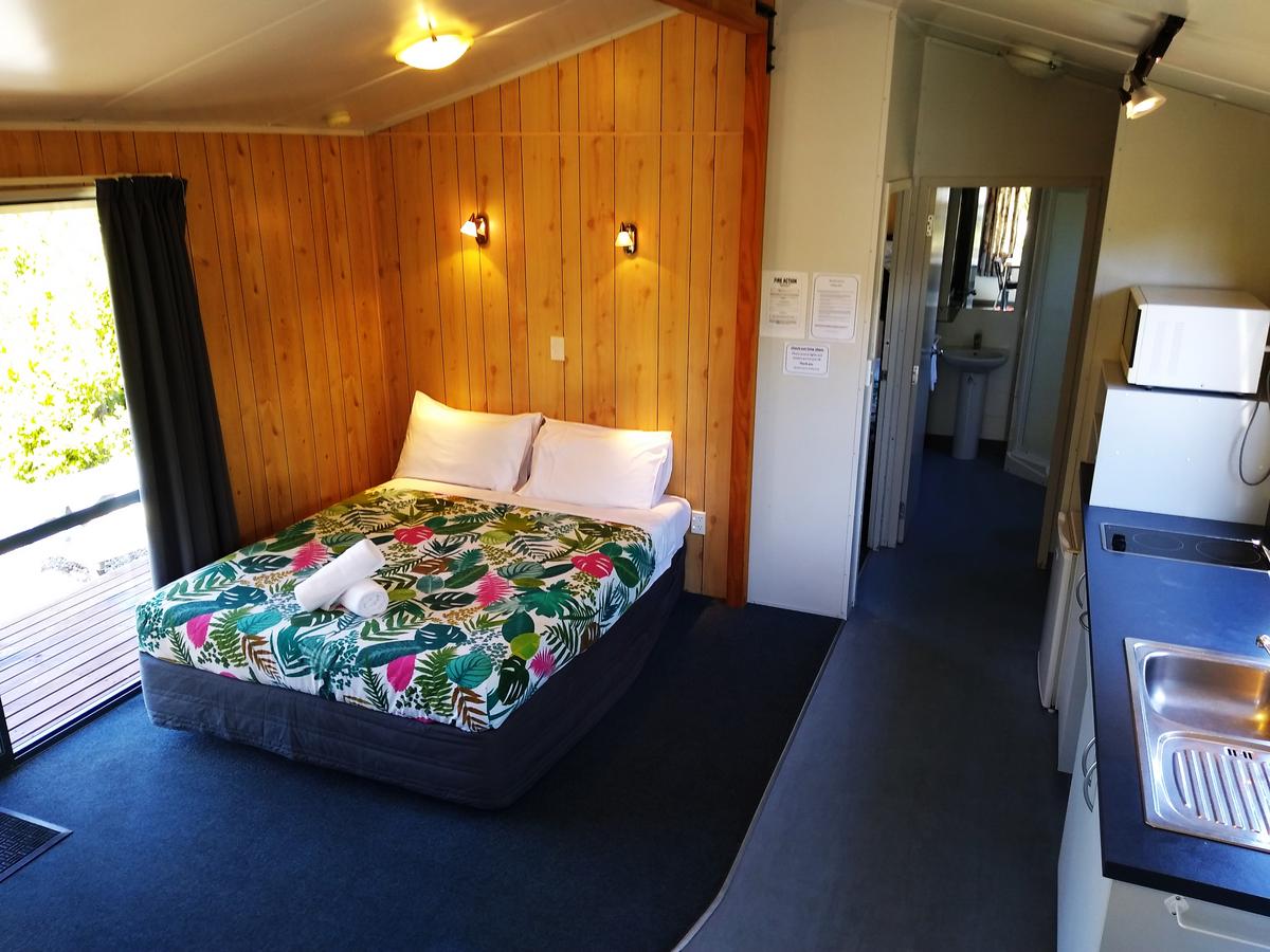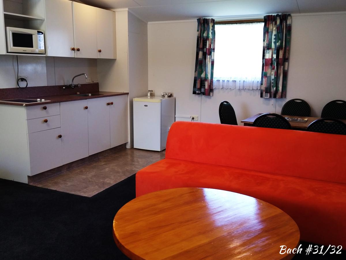 Our (older style) self-contained baches have everything you need for an affordable yet relaxing and comfortable holiday experience. Each unit can sleep 2-6 people in either a studio unit or two bedroom units. Complete with dining area, TV, toilet, shower, and a well equipped kitchen, these units are designed for your convenience. Bedding and bath towels are included, no toiletries included.